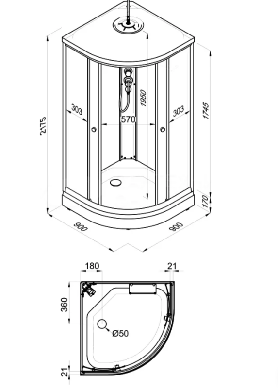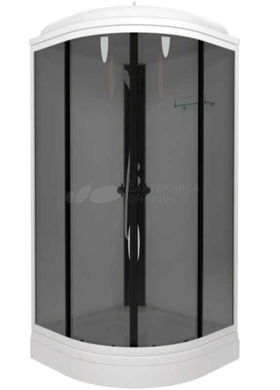 Размеры (Ш Г) - 90x90 смШирина входа - 57 смВысота поддона - 17 смГлубина поддона - 6.5 смКонструкция дверей - РаздвижнаяТолщина стекла - 4 ммИсполнение стекла - ТонированноеЦвет профиля - ЧерныйФорма - четверть кругаПоддон с сифоном - да